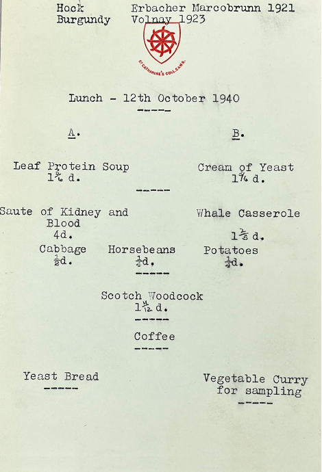 The menu below is for a lunch served to Lord Woolton, the Minister for Food, at St Catharine’s College, Cambridge, demonstrating a range of foods on which the country could subsist in the event of total blockade. It included Leaf Protein Soup. Woolton was not impressed. He recorded in his diary that he had to resort to a Turkish bath and massage to rid his liver of the protein he’d consumed as part of the ‘purely scientific lunch.’ (from Norman Pirie papers, RS, NWP c.149, at Bodleian Library, Oxford).